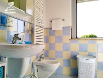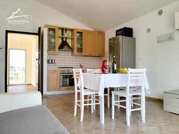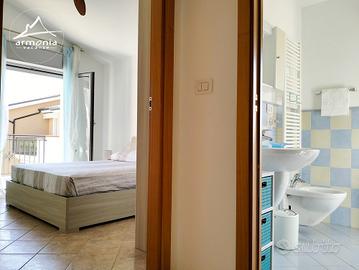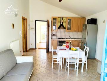 Bilocale 2 posti + 2: camera matrimoniale, soggiorno con divano letto matrimoniale, angolo cottura, bagno/doccia, terrazzo vista mare frontale.