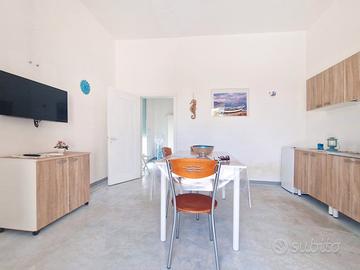 Trattasi di 2 piccoli bilocali di circa 35mq cadauno, situati uno sul fronte strada e altro sul retro come come il presente, il cui ingresso avviene dal vialetto in comune chiuso con cancelletto. Il mare con scoglio basso si trova alle spalle degli app. a 100mt. Le spiagge si trovano a 4km. Le auto si parcheggiano per strada ove si trova posto o nelle stradine attigue. Zona centrale per fare passeggiate a piedi.