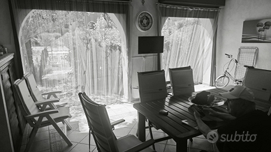 Fittasi villa a schiera piano terra, fronte piscina, in uno dei più grandi villaggi d'italia. Nel borgo aranci del borgo San Basilio. Ingresso soggiorno ampio con divani letti, due camere letto, cucinino, ampia sala pranzo, bagno, zona verde.