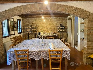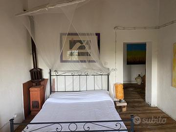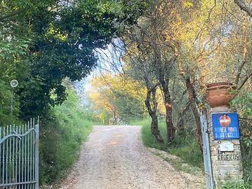 Nel giardino, una piccola pergola ricoperta di vite offre ombra e quiete nelle ore più calde, mentre all'orizzonte, tra le pieghe delle colline, si intravede il profilo di un vecchio sentiero che porta lontano, verso altri angoli di silenziosa bellezza.