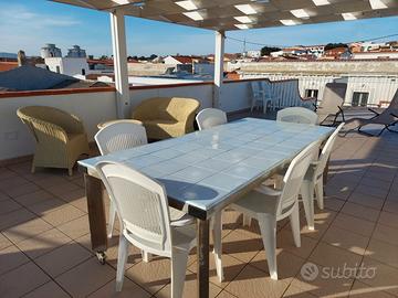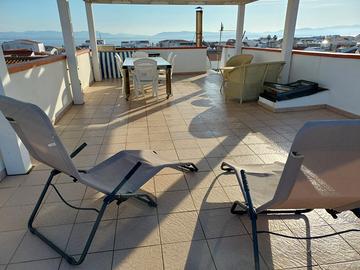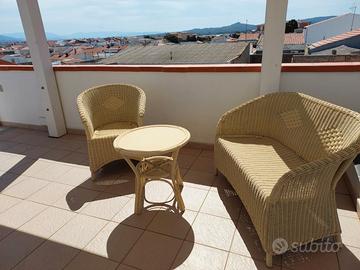 Luminosissima, indipendente e climatizzata, su Via Roma offre comodità del centro, intimità e opportunità di cucinare in casa e in terrazza i prodotti di eccellenza: tonno rosso, pesce spada, crostacei, frutta e verdura. Vicinissimi: lo Scoglio di Elisabetta, la spiaggia Sotto Torre, il porto. In auto in pochi minuti: Le Saline, Spiaggia Grande, Mangiabarche, Nido dei Passeri. Arredata e accessoriata: WiFi; 2 TV, lavatrice, lavastoviglie, forno elettrico, frullatore, bollitore, tostapane, caffettiera elettrica, phon, ferro da stiro, scopa elettrica, pentole, piatti, stoviglie e tutta la biancheria per letti, bagno, cucina e mare. Ha due cucine, una interna e una esterna, due grandi terrazze attrezzate con tavoli e sedie, grande terrazza superiore parzialmente coperta per pranzi e cene indimenticabili con vista impareggiabile sul mare e sulla torre saracena; camera matrimoniale, cucina, soggiorno con divano letto matrimoniale, angolo con letto singolo, bagno finestrato con doccia. Calasetta è ideale per: vela, kite, surf, bagni fantastici in spiagge con mare cristallino adatto anche ai bambini; corsi di equitazione e passeggiate a cavallo; sul porto noleggio gommoni e barche e traghetti per Carloforte. Ideale per scoprire il Sulcis le sue spiagge, la sua archeologia. Su via Roma consentito carico e scarico auto, parcheggio gratuito nelle le strade limitrofe. Calasetta dista un'ora da Cagliari, tre ore da Olbia. Tariffe comprensive delle utenze, attrezzature, biancheria casa e mare, ombrelloni e sedie sdraio da gennaio a maggio gennaio- maggio 78 euro+ 75 euro per le pulizie. Giugno e settembre 100/notte, luglio130/notte agosto 140/notte. Il referente a cui dare 75 euro per le pulizie, vi consegnerà le chiavi, facendo trovare la casa perfetta. Animali non ammessi. No fumatori. Richiesta cauzione per corretto smaltimento rifiuti