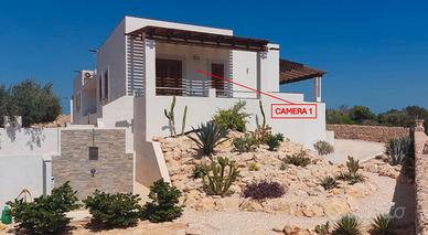 La Camera matrimoniale con bagno annesso ed ingresso indipendente ha come dotazione aria condizionata, Smart TV, Frigo da hotel con piccola ghiacciaia, Asciugacapelli e Veranda privata e un tavolino con due poltroncine. L'unica area condivisa con l'unica altra camera che abbiamo pari tipologia è l'angolo cottura dotato di stoviglie e tutto il necessario per cucinare che è esterno e situato nell'ara Barbecue ma in veranda è presente un tavolo con sedie dove potrete pranzare/cenare in tutta tranquillità. Il prezzo comprende Pulizia Finale, Utenze, primo set di lenzuola e salviette (viso, doccia, intima) con cambio settimanale. La struttura si trova sopra Cala Pisana che è anche il primo accesso al mare raggiungibile a piedi a 300m. È a meno di 500m dal supermercato più grande dell'isola e a circa 1km da via Roma che è il centro di Lampedusa lato opposto al mare.