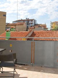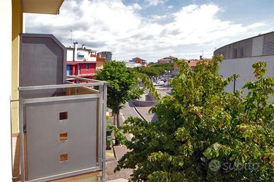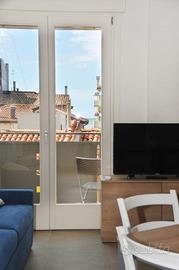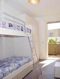 Trivano centralissimo, 400 mt dalla spiaggia, piano secondo con ascensore, si compone di: ampio soggiorno con divano letto matrimoniale angolo cottura e terrazzo con scorcio di vista mare, disimpegno, ripostiglio, bagno finestrato con box doccia, spaziosa camera matrimoniale e seconda camera con letto a castello, entrambe con accesso ad un secondo terrazzo.