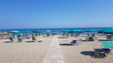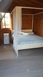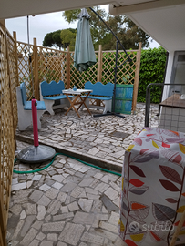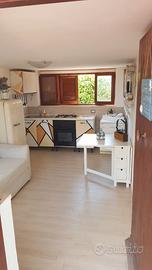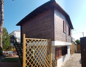 Tra San Felice Circeo e Terracina -zona golfo Sereno- residence Maga Circe, lato mare con accesso privato alla spiaggia, ombrellone e 2 lettini ad uso esclusivo (da verificare). La baita é disposta su 2 piani, ha spazi ridotti ma efficientati da soluzioni salvaspazio. Al piano terra in muratura si trova la cucina con un divano letto e un tavolo salvaspazio apribile facilmente. Al primo piano, collegato mediante una scala esterna, si trovano circa 8 mq di ballatoio esterno calpestabile da cui si accede alla nuovissima casetta in legno di pino (non é un bungalow, le lastre di legno sono spesse 14 Cm e hanno uno strato isolante che efficienta la temperatura interna), dove si trovano un bagno, 1 stanza con letto soppalcato a una piazza e mezzo e un salottino con un letto matrimoniale a baldacchino. Per un totale di circa 50 mq interni e 75 mq esterni (divisi in 2 aree ad uso esclusivo). la soluzione ha fino a 6 posti letto ma é ottimale per 4 persone, visto che il bagno é al primo piano raggiungibile con scala esterna. Il mare è raggiungibile a piedi in 4 minuti effettivi senza dover attraversare alcuna strada. Si hanno 2 lettini e 1 ombrellone con posto pre-assegnato fisso per la settimana.