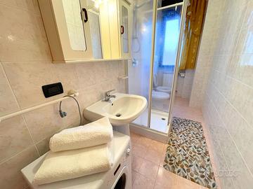 Bagno finestrato con doccia, lavatrice, bidet e asciugacapelli