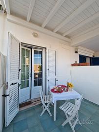 Vi è un comodo terrazzino loggiato con tavolino per pranzi/cene all'esterno con vista sul mare.