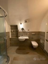 - Un bagno, non finestrato, realizzato in elegante pietra porfido del Trentino, con comoda doccia.