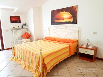 Affittasi a Cupra Marittima in viale Taffetani villetta a schiera vista mare di 120 metri quadri. La casa si sviluppa su due livelli e presenta un garage di 37 metri quadri. Al primo livello ci sono soggiorno-cucina, camera matrimoniale, bagno, corridoio e ampia veranda abitabile con vista sul mare. Al secondo livello ci sono una camera matrimoniale, una camera con 4 letti singoli, bagno e balcone vista mare attrezzato con ombrellone, tavolo e sedie. L'appartamento può ospitare fino a 8 persone.