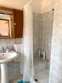 Il bagno è completo di lavabo, wc, bidet ed una doccia con tenda.