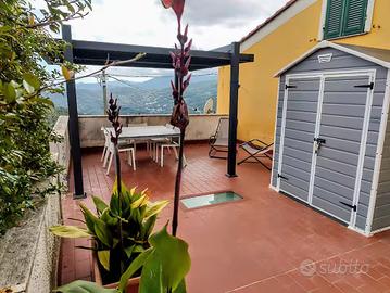 La casa è situata in una zona molto tranquilla a Calice Ligure nell'entroterra del comprensorio Finalese; in un tipico borgo di collina ligure immerso nel bosco di pini, querce, castagni e lecci, nei quali è possibile passeggiare su percorsi segnalati per gli amanti del trekking, o di sentieri dedicati agli amanti della MTB (a circa 50mt si trova la fermata dello shuttle che porta alla Base Nato), per gli amanti del free climbing la posizione è ottimale. Finale Ligure ed il mare distano circa 12 km. La casa è immersa nel verde, gas free e le spese sono ridotte grazie all'impianto fotovoltaico. E' disposta su tre livelli: PIANO TERRA all'ingresso si trova la zona giorno con cucina (induzione), tavolo 6 posti e salotto con divano e TV 50". E' presente un divano letto PIANO 1 al primo piano si trova una camera con due letti singoli o un letto matrimoniale dal quale si accede al terrazzo di circa 40mq PIANO 2 al secondo piano di trova la camera da letto matrimoniale. I piani sono collegati tra loro da una scala a chiocciola interna e da una scala esterna. La casa è dotata di aria condizionata (caldo/freddo), stufa a pellet nella zona giorno, lavastoviglie, piano cottura a induzione, forno, frigorifero con congelatore, lavatrice, predisposizione wifi, impianto fotovoltaico per la produzione di energia elettrica, parcheggio privato a circa 40mt. Si propone affitto ad uso transitorio/turistico da 12 a 18 mesi