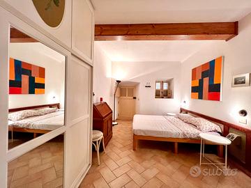 Primo piano: ampio salone con volta storica affrescata, cucina design su misura, camera con vista a 180° sulla collina, bagno. Altro piano: camera, bagno privato, uscita indipendente.