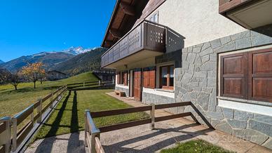 A soli 4km da Bormio, raggiungibile in 5 minuti di auto, appartamento piano terra con giardino privato, composto da soggiorno con angolo cucina, camera matrimoniale, camera con un letto singolo e un letto a castello, bagno con doccia.