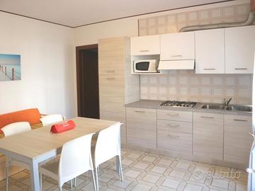 DISPONIBILE DA SABATO A SABATO DURANTE L'ALTA STAGIONE. Questa recente e moderna palazzina è situata nel cuore di Lignano Sabbiadoro a soli 3 minuti a piedi dalla spiaggia. Ogni appartamento è dotato di tv e cassaforte. La palazzina dispone di antenna centralizzata, di posti auto numerati e di un ampio giardino recintato. Il servizio spiaggia non è compreso nel prezzo. Il bagno più vicino all'appartamento è il numero 10 (Delfino). Bilocale composto da un soggiorno con angolo cottura e divano letto singolo, tv e microonde, camera a tre letti (uno matrimoniale più uno singolo), bagno con doccia/bidet/wc e ampio terrazzo arredato. Aria condizionata e pulizie finali sono compresi nel prezzo. Nel regolamento di locazione dell'agenzia sono indicate tutte le modalità dei servizi di cui sopra. Misure posto auto: 5,00×2,10×3,00. Questo appartamento NON e' stagionale. Si accettano SOLO FAMIGLIE, non gruppi di ragazzi. Per ulteriori informazioni e per conoscere le disponibilità vi preghiamo di consultare il sito web dell'agenzia.