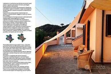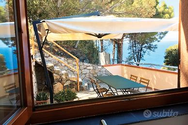 Bilocale Vista Mare - 3 posti letto (Massimo 2 adulti + bambino) L'appartamento di circa 50 mq si compone di un ingresso privato, cucina recentemente rinnovata con sala da pranzo e un divano letto. La zona notte è composta da una camera matrimoniale con letto singolo e un bagno completo con cabina doccia. A disposizione degli ospiti ampi spazi esterni attrezzati per mangiare e rilassarsi, circa 50 mq di terrazzo sovrastante e circa 200 mq di spazio esterno antistante, con incredibile vista mare, immersa nel verde di un bosco terrazzato e recintato di circa mille metri a disposizione, che circondano la struttura. Informazioni sulla posizione: - zona tranquilla, panoramica - una parte della casa è perfetta per chi viaggia con amici a 4 zampe, di piccola taglia, chiusa e recintata da muretto alto 90 cm Tipo arredamento: - curato Servizi interni all'appartamento: - fuochi a induzione; tv; forno; fornetto elettrico; forno a gas; lavatrice; lavastoviglie; phon; ventilatore; seggiolone per bambini Servizi esterni all'appartamento: - spazio esterno attrezzato; giardino; terrazza vista mare; doccia esterna; posto auto; completamente recintato Distanze: - Marciana Marina 16 km - Marina di Campo 16 km - Portoferraio 32 km - Capoliveri 38 km Distanze dalle spiagge: - Spiaggia di Campo lo Feno: 1,3 km - Spiaggia delle Buche: 1,3 km - Scogli di Chiessi: 3 km - Spiaggia di Patresi: 5 km - Scogliere di Pomonte: 5 km - Sant'Andrea: 7 km - Fetovaia: 8 km - Cavoli: 12 km