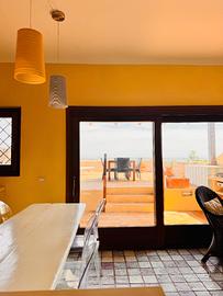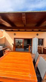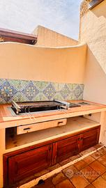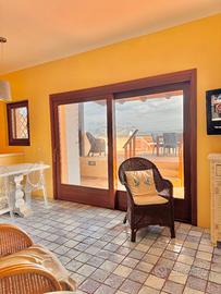 Accesso diretto alla terrazza panoramica, parzialmente coperta, con tavolo estensibile fino a 10 posti, doppi barbecue e lavandino esterno.