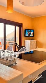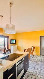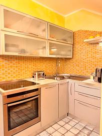Seconda zona giorno con angolo cottura attrezzato (piano a induzione, forno, frigorifero alto con freezer, lavastoviglie, macchina del caffè e tostapane).