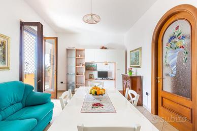 Ampio giardino o terrazza attrezzata con barbecue, lettini prendisole e zona relax ombreggiata per pranzi all'aperto. Ingresso privato recintato garantisce privacy, con parcheggio carrabile e vista sul verde mediterraneo.