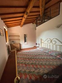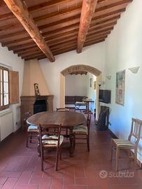 In antico casolare appartamento di 6 vani con tre camere doppie, due bagni, cucina abitabile, soggiorno e sala. La casa è completamente arredata e dotata di ogni comfort, come la wi-fi e una stanza lavanderia. Parcheggio privato esclusivo e ampio giardino. Immersa nella campagna con campi e boschi, nella tranquilla e nella assoluta sicurezza, si trova a pochi minuti dal centro di Montevarchi.