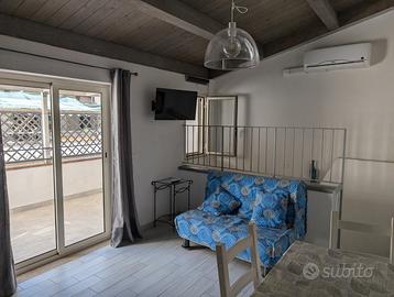 Zona via indipendenza/villa delle sirene. Entrata su strada pedonale, primo piano camera da letto con letto matrimoniale e singolo + bagno con doccia; secondo piano soggiorno/cucina, letto singolo, bagno di servizio, e terrazzo. la casa e' attrezzata con aria condizionata, tv e lavatrice.