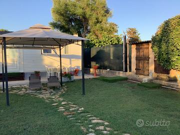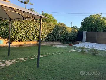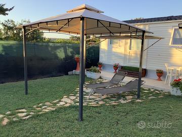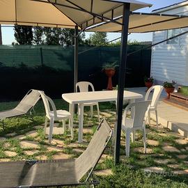 Doccia esterna, gazebo, 2 sdraio e piccola piscina per bambini.
