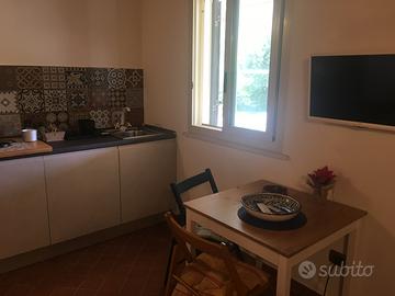 dotata di soggiorno con angolo cottura con un piano ad induzione (1 fuoco),forno micronde, frigo, macchina per caffe'Nespresso, tv, bagno privato e piccola camera da letto ( letto alla francese 140mm).