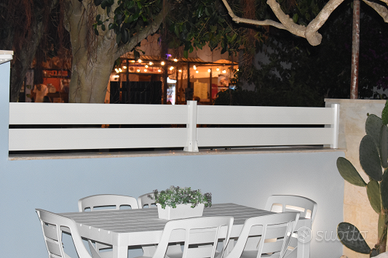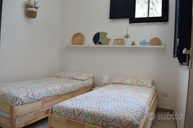 Disponibile intera villetta con ampio spazio all' aperto dotato di 2 tavoli per pranzare/cenare fuori,salottino, lavanderia esterna con doccia e sanitari. All' ' interno soggiorno con angolo cottura dotato di piano ad induzione, tavolo apribile,divano letto,aria condizionata, TV. Due camere: una matrimoniale, l'altra doppia con possibilità di tenerla tripla. Bagno. Completa di ogni utensile necessario, tostapane, phon, ferro da stiro ecc ., biancheria da letto e bagno. Non è necessario l'uso dell automobile per raggiungere alcun servizio primario e secondario, tutto è nelle immediate vicinanze della villetta (supermercato, panetterie, fruttivendolo, pescheria, ferramenta, bar, pub, locali per pranzare e cenare oltre a negozi e bancarelle) poiché nel cuore della incantevole Torre dell Orso a MT 150 dalla sua bianca spiaggia e dalla sua pineta dove cercare ombra e relax . Ideale per 6 persone. Animali non ammessi.