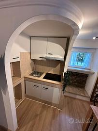 Cucina con piano cottura ad induzione, pentole, stoviglie, macchinetta del caffè e bollitore.