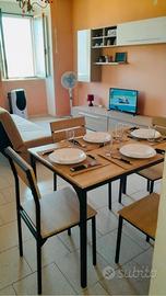 Casa Vacanza al centro del paese. Costituito da due livelli: Zona giorno con sala da pranzo, cucinino, bagno con doccia; Zona notte con 2 camere da letto e bagno. Ampio terrazzo con veranda panoramica sul paese e vista mare. Possibilità di fare colazione, pranzo e cena all'aperto. Sono compresi set per servizio bagno, lenzuola e copriletto per la zona notte. Divano letto presente nella zona giorno. Cucina con: stoviglie, piccoli elettrodomestici, scaldabagno, lavatrice e frigo, Casa su 2 livelli. Zona giorno entrata principale, zona notte con veranda al piano superiore .