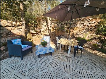 La casa è circondata dal verde di un giardino ed ha a disposizione un'ampia tettoia con tavolo e sedie per pranzare e cenare all'aperto.