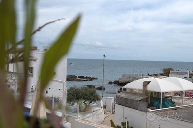 La nostra caratteristica e luminosa abitazione Argento Mare è al primo piano e si trova lungo la secolare cinta muraria del centro storico, in posizione centralissima. Ha l'ingresso del grande portone di fronte la magnifica Chiesa barocca di Maria Santissima del Suffragio e gode di privilegiata vista panoramica sul mare, Cala Porta Vecchia e il nuovo lungomare. È dotata di due balconi uno per ciascun ambiente, il primo sulla strada principale che traguarda direttamente il campanile della vicina Cattedrale e l'altro sulla via Mulini verso il mare e le spiagge. Quest'abitazione è provvista sia di aria condizionata che di potente ventilatore e wifi gratuito, comprende una camera da letto matrimoniale con cabina armadio e monitor, un ampio soggiorno con divano letto a chaise longue, credenza antica completa di stoviglie e ampio tavolo da pranzo con comode sedute, un salottino con poltroncine e tavolino da caffè. La zona cottura ha un doppio piano a induzione e utensili vari, frigorifero, forno a microonde e macchina da caffè. Bagno comodo e completo con bidet e vasca con doccetta, fornito di asciugacapelli. Asciugamani e lenzuola in dotazione. Situata a 100 metri dalla spiaggia di Porta vecchia, a 1,2 km dalla Stazione ferroviaria e a 59 km dall'Aeroporto di Bari Karol Wojtyla. Vi sono nell'immediata prossimità numerosi bar, caffetterie, gelaterie, ristoranti e gastronomie tipiche. Nelle vicinanze supermercato, macelleria, negozi di frutta e verdura, panificio, lavanderia self-service e farmacia.
