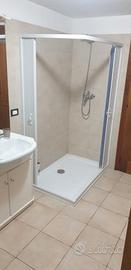Bagno con grande doccia, lavatrice e accessori.