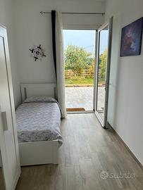 Camera matrimoniale con vista sul giardino, cameretta singola con accesso al patio-giardino, bagno con ampia doccia. Terrazza sul giardino, attrezzata per mangiare all'aperto, ampio solarium di circa 100 mq.