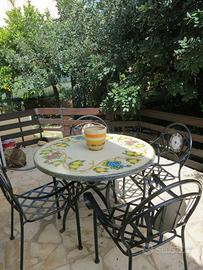 Due verande esterne arredate con tavoli in ceramica lavica dipinti a mano, sedie in ferro battuto, sdraio, divani e ombrelloni.