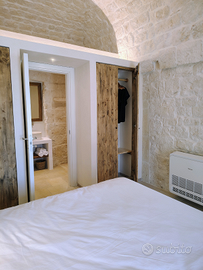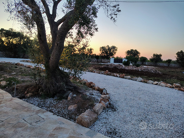 Casa vacanze in trulli saraceni e lamie in pietra, composta da 2 camere da letto (ognuna con bagno privato), living con cucina interamente allestita, divano letto con doppio materasso e terzo bagno di servizio, patio esterno con tavolo e sedie, arredi da giardino, terreno ad olivi e mandorli a perdita d' occhio, parcheggio privato gratuito.