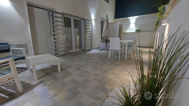 Casa indipendente a 1.5 km dal mare cristallino di San Pietro in Bevagna. L'alloggio e' composto da ampio salone e cucina con divano letto, due camere matrimoniali e 3 letti singoli, 2 bagni e patio esterno con doccia.