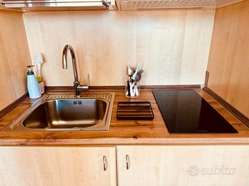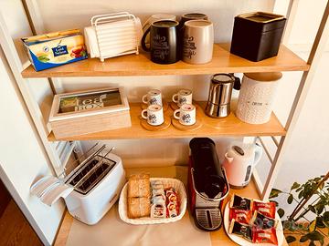 Dispone di frigorifero, microonde, macchina caffè Nespresso con cialde, tostapane, bollitore, piano cottura elettrico in vetroceramica, Smart TV con profilo Netflix attivo.