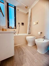 Bagno con lavandino, bidet, wc e vasca con dispenser per bagnoschiuma, shampoo e balsamo, phone e piastra per capelli.