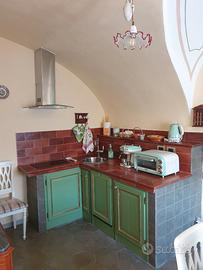 Il soggiorno/sala da pranzo è caratterizzato da una bella e pratica cucina in muratura munita di tutti gli accessori: lavandino, lavastoviglie, piastra di cottura a induzione con cappa a carboni attivi, ampio piano di appoggio sul quale trovano collocazione il fornetto, il bollitore e la macchina per il caffè espresso sempre offerto dal padrone di casa, mentre il grande frigo è anche munito di congelatore. Sono inoltre presenti un tavolo da pranzo e una credenza nella quale si può trovare tutto il necessario per la preparazione e la degustazione dei cibi.