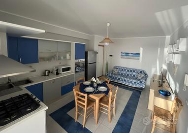 Casa vacanze, ideale per 4/6 persone, così composta: prima camere con letto matrimoniale, seconda camera con letto una piazza e mezza,soggiorno/cucina con divano letto due posti, bagno, posto auto, giardino privato recintato e piscina condominiale, con accesso riservato x 5 persone con lettini e ombrellone.