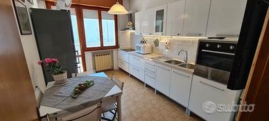 Dalla luminosa cucina si accede al balcone con tavolo esterno.