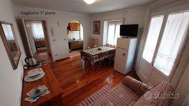 Primo piano, 5 posti letto: soggiorno con angolo cottura, due camere, bagno con doccia e lavatrice. Non disponibili luglio e agosto 2025