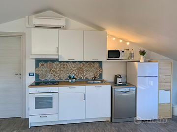 Ampio open space con cucina accessoriata (piano ad induzione, forno elettrico, microonde, bollitore, frigorifero, lavastoviglie, macchina del caffè), lavatrice, comodi divano e poltrona che all'esigenza diventano un letto matrimoniale e singolo, grande camera matrimoniale con divano, bagno finestrato in stile moderno corredato da ampia vasca, TV satellitare, internet wi-fi. Tutti i locali sono climatizzati, luminosi e l'ambiente è silenzioso e totalmente rilassante.