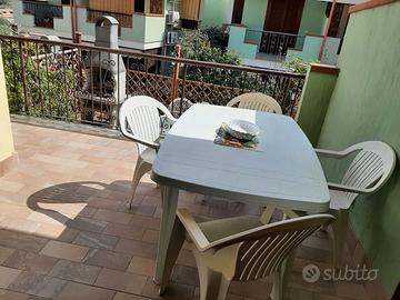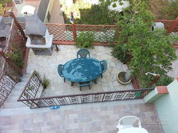 Affittasi villetta a schiera su due livelli composta da: 2 camere da letto matrimoniali con annesse due terrazze al piano superiore. Le camere sono dotate di ventilatori nel soffitto. Al piano terra: Ingresso sala con angolo cottura, antibagno con lavabo e bagno con box doccia. Sempre al piano terra una spaziosa veranda immette ad un sottostante giardinetto completo di barbecue e doccia. La casa è completamente arredata ed è dotata di tutti gli elettrodomestici tra cui lavatrice, TV e wi-fi. Un garage privato completa gli accessori. La casa dista circa 300 metri dal centro del paese e a pochissimi minuti, in macchina ,dalle spiagge. Ristoranti, bar, pizzerie e fermata del pulmino pubblico che porta alle spiagge sono nei dintorni della casa. Non sono ammessi animali