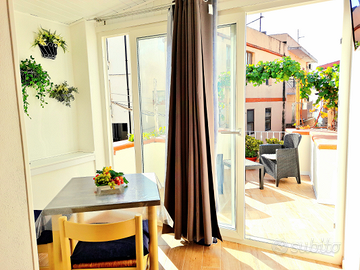 Appartamento x 2 persone composto da letto matrimoniale, cucina, bagno, zona giorno, aria condizionata, wifi gratuito, biancheria e asciugamani x la casa ad uso gratuito, parcheggio privato gratuito, 2 terrazze delle quali una con vista panoramica. Per il mare ombrellone e asciugamani ad uso gratuito.
