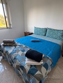 Appartamento primo piano con a disposizione due camere da letto, tra cui una con balcone, e una camera con due letti singoli e un bagno con vasca in comune.