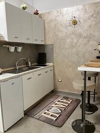 Il monolocale è composto da ampio ingresso con tv da 37 pollici, tavolo con 4 sedie, sulla sinistra un angolo con cucina attrezzata, macchinetta caffè espresso, bollitore, fornetto a microonde, piano cottura a induzione con servizio pentole adatte, bagno con doccia e phon a parete da 1600watt; sulla destra si trova la camera da letto con ampio armadio di 6 ante una Smart tv da 24 pollici (Netflix Gratuito) altro armadio a muro con cassettiera inclusa.