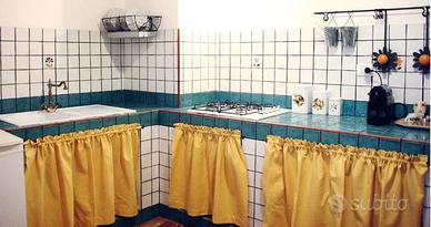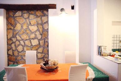 La casa si articola su due livelli, soggiorno e cucina al piano terra, camera da letto e bagno al secondo livello. La camera da letto ha un letto matrimoniale in ferro battuto e si affaccia sulla zona giorno. Il bagno e' completo di tutti i sanitari. La cucina in muratura e' completa di fornelli, frigo, lavandino e utensili, piatti etc Tavolo rettangolare in vetro e sedie. Divano, un letto singolo e un letto singolo estraibile con materassi di buona qualita'.