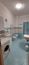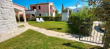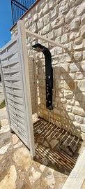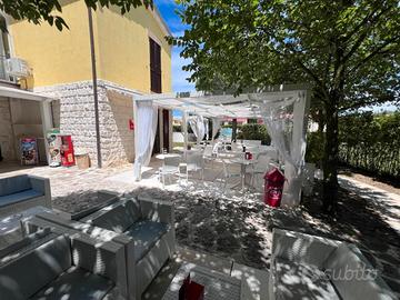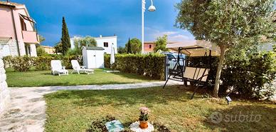 Ingresso indipendente con ampio giardino su due lati, completo di ombrellone, due lettini da sole, dondolo e comodo divanetto. Ampio pergolato con tavolo e sedie per mangiare all'aperto e posto auto di fronte all'immobile. L'area esterna è dotata anche di lavabo e cabina doccia idromassaggio con acqua calda/fredda ideali per il massimo relax all'aperto.