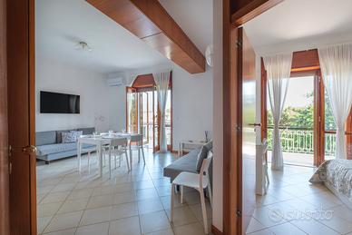 Appartamento composto da una camera da letto con letto matrimoniale e un soggiorno-cucina con parete attrezzata e 2 divani letti da una piazza e mezzo. Ampio e luminoso, con 2 balconi che affacciano sul parco comunale, dista soli 50 metri dal corso porticato e 20 metri da un supermercato aperto tutti i giorni fino alle 22.