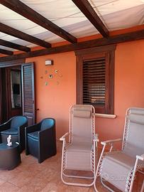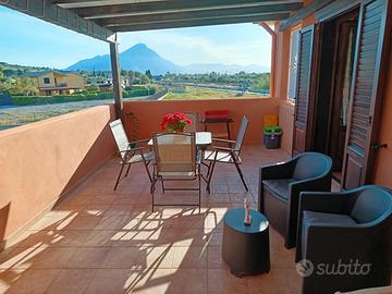La zona giorno/ notte e ben illuminata, contiene un letto matrimoniale completo di lenzuola e coperte, una panca e uno spazioso armadio. Il bagno è dotato di lavatrice, box doccia, wc, lavandino con ampio specchio , bidet ed è completo di asciugamani . Infine una meravigliosa terrazza coperta si affaccia lato monte, accessoriata con un piccolo salottino e un tavolo in vetro con 4 sedie e un barbecue.